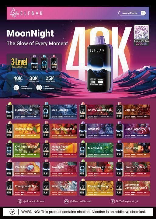 The Elf Bar MoonNight 40,000 Puffs Disposable Vape offers outstanding durability with a rechargeable design and long-lasting e-liquid supply. It combines mesh coil technology for smooth, rich flavor and thick vapor output. With Type-C fast charging, you can recharge quickly and enjoy uninterrupted sessions. Its compact body is stylish yet practical, making it easy to carry anywhere. The simple draw-activated system makes it beginner-friendly, while the large puff count appeals to experienced vapers seeking endurance. With fruity, icy, and blended flavors, the MoonNight offers something for every taste, making it one of the best disposables available in the UAE.